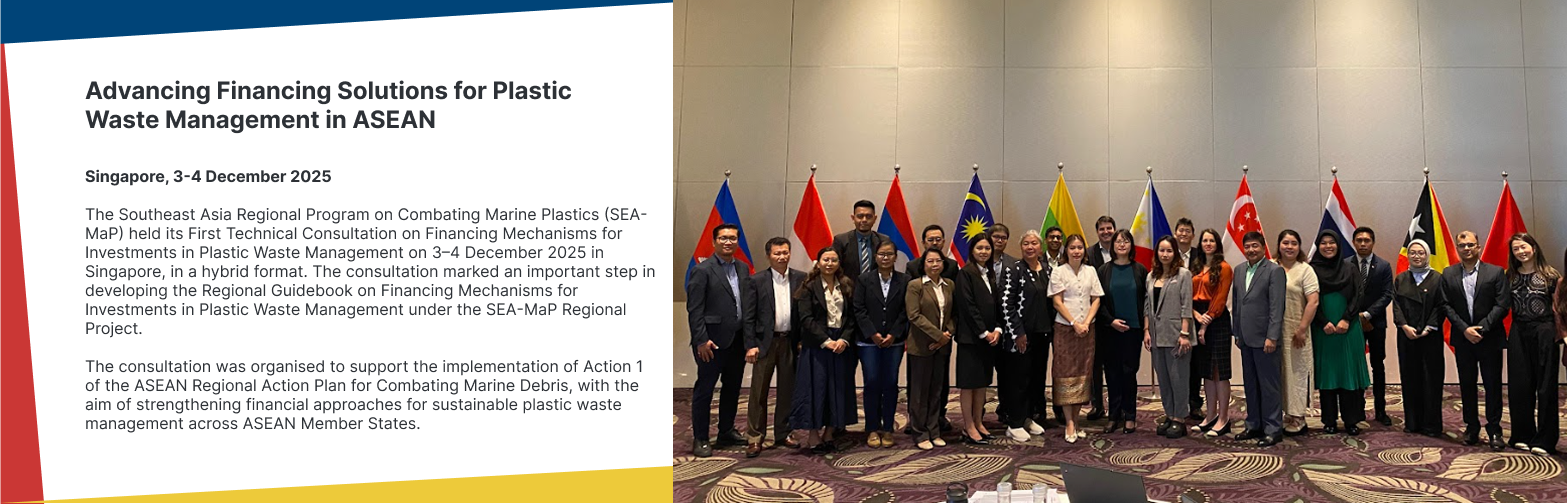 Singapore, 3-4 December 2025: The Southeast Asia Regional Program on Combating Marine Plastics (SEA-MaP) held its First Technical Consultation on Financing Mechanisms for Investments in Plastic Waste Management on 3–4 December 2025 in Singapore, in a hybrid format. The consultation marked an important step in developing the Regional Guidebook on Financing Mechanisms for Investments in Plastic Waste Management under the SEA-MaP Regional Project. The consultation was organised to support the implementation of Action 1 of the ASEAN Regional Action Plan for Combating Marine Debris, with the aim of strengthening financial approaches for sustainable plastic waste management across ASEAN Member States.