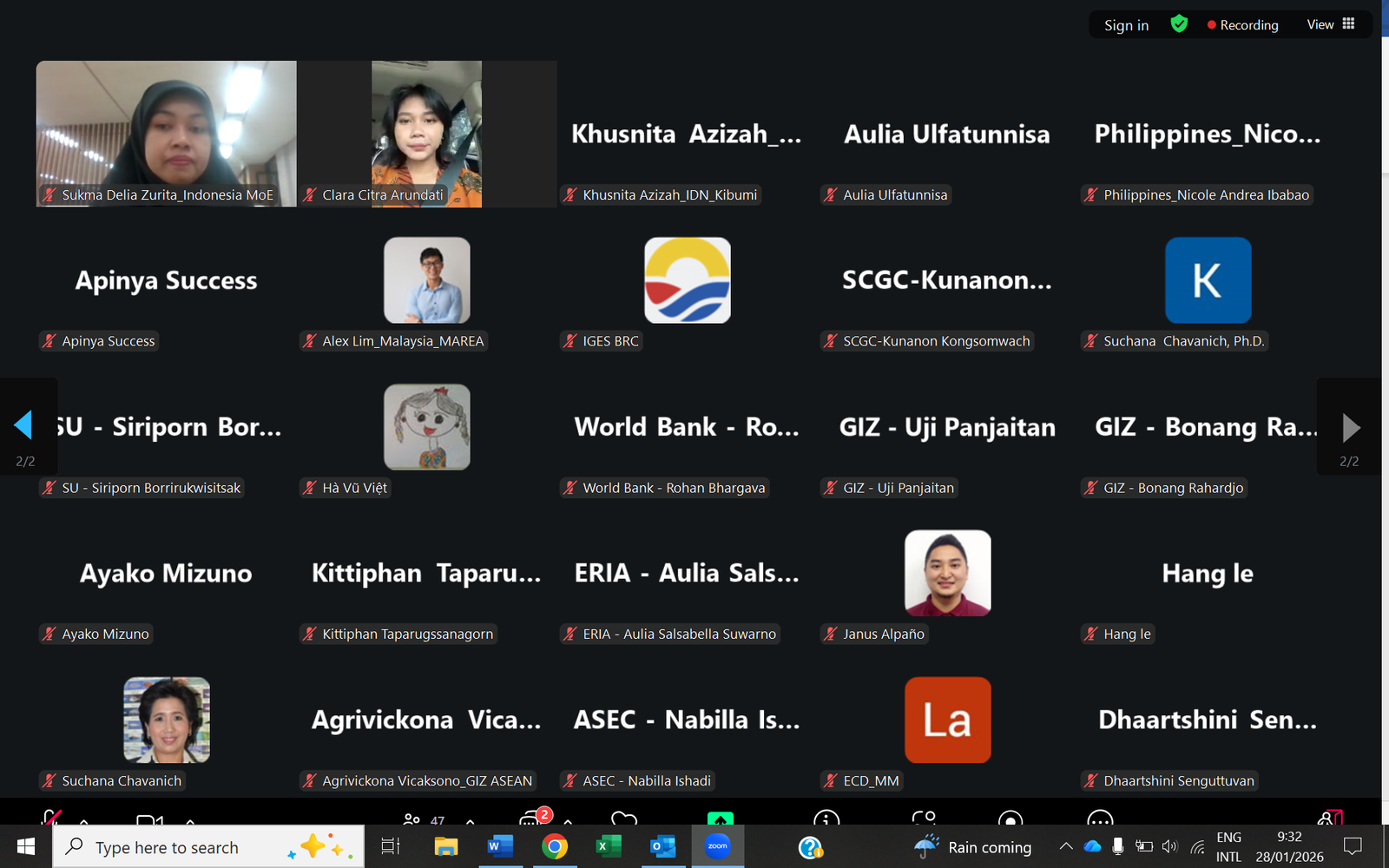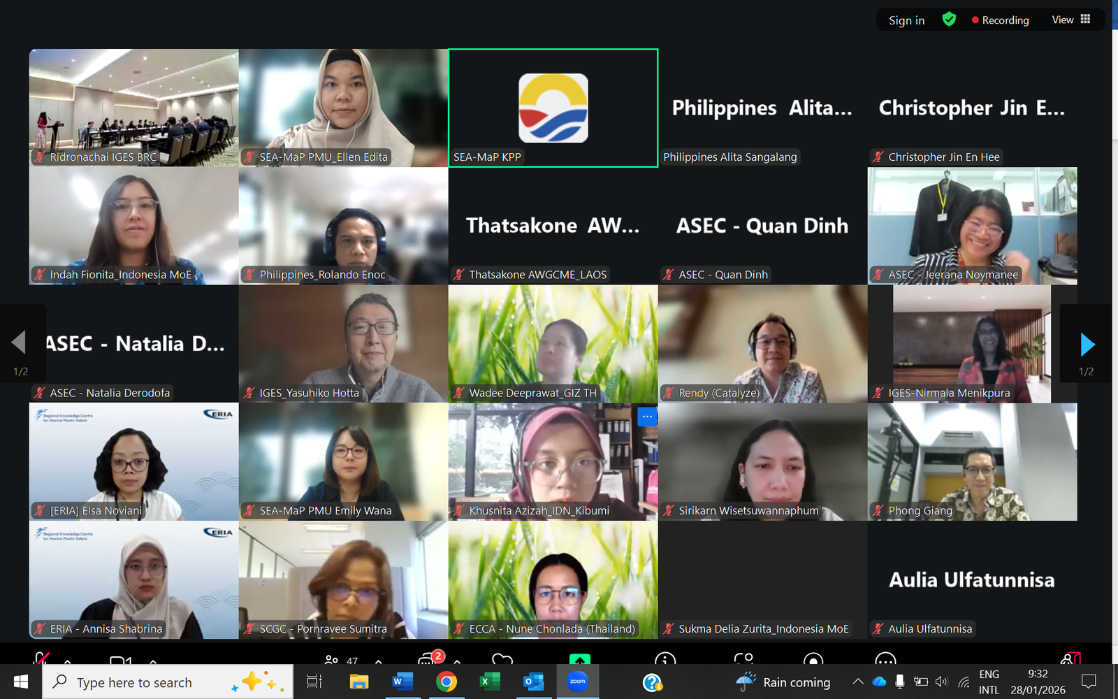 Video Conference, 28 January 2026: The SEA-MaP Regional Project organized the Prototype Introduction, Second Stakeholder Consultation with the Project Steering Committee (PSC), and Second Coordination Meeting with Development Partners and Knowledge Platforms of the Regional Platform for Knowledge and Partnerships. The workstream supports the implementation of the ASEAN Regional Action Plan for Combating Marine Debris (RAP), particularly Action 8 “Strengthen ASEAN Regional Knowledge Network on Marine Plastics”, Action 10 “Coordinate Regional Training Programs on Plastics and Waste Management”, and Action 13 “Establish a Regional Platform for EPR Knowledge and Implementation Support”